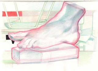 ...Como consecuencia, ante las figuras de escayola, ¡he de utilizar los recursos que la intuición me brinda!, con lo cual se incrementa la parte divertida y anecdótica, intrascendente, del dibujo... De paso, termino enamorado de las suaves formas...